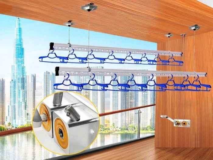 Hệ thống vòng bi giúp tăng độ êm ái, nhẹ nhàng khi quay tay, đồng thời giúp giàn phơi vận hành trơn tru và ổn định. Các bát cáp có thiết kế đặc biệt, gắn sát vào tường giúp bảo vệ giàn phơi khỏi mưa nắng và bụi bẩn, nâng cao tuổi thọ của sản phẩm.