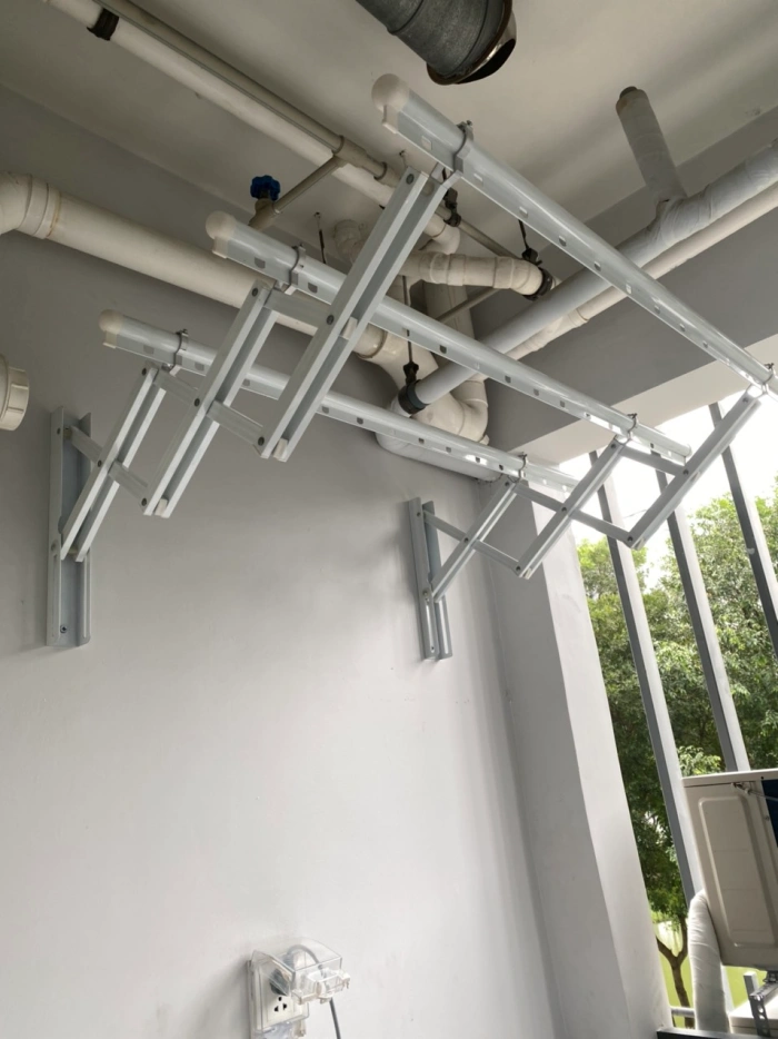 Thiết kế xếp ngang cố định gắn tường, có thể kéo ra khi cần phơi và gấp gọn lại sau khi sử dụng, giúp tiết kiệm diện tích tối đa và tạo sự gọn gàng cho khu vực sân phơi.