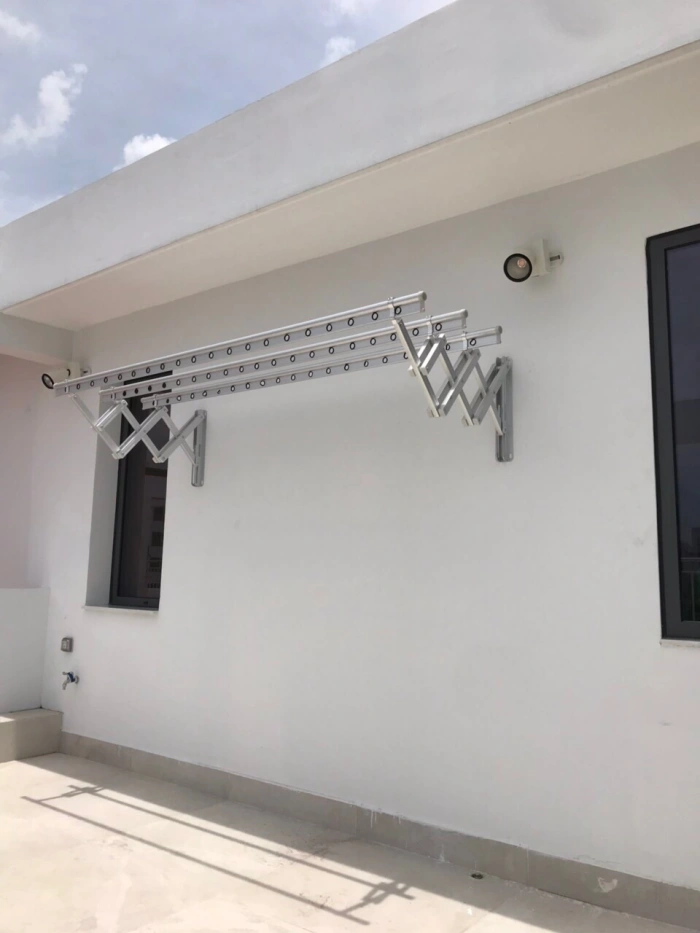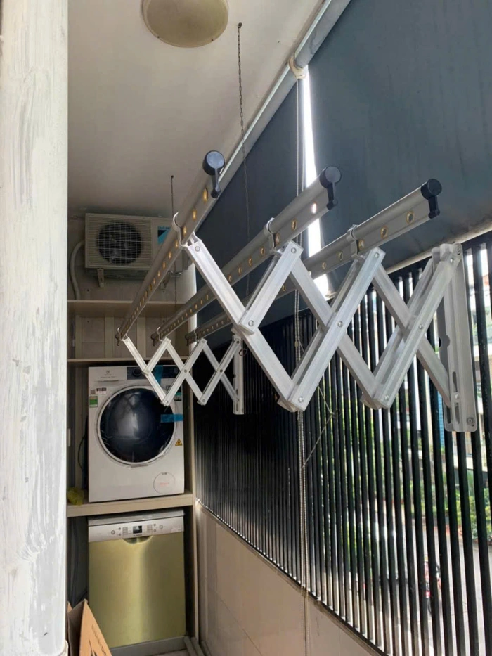 Thiết kế xếp ngang giúp tiết kiệm diện tích, phù hợp với nhiều không gian như căn hộ chung cư, nhà phố, biệt thự hay khu tập thể. Giàn phơi có khả năng kéo ra – gập vào linh hoạt, giúp người dùng dễ dàng thao tác mà không tốn sức.