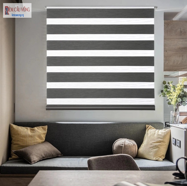Rèm cầu vồng 2 lớp, còn được biết đến với tên gọi rèm Zebra, là sự kết hợp độc đáo giữa rèm cuốn và rèm vải. Cấu tạo của rèm gồm hai lớp vải đan xen lẫn nhau, với một lớp vải dệt kín (opaque) và một lớp vải lưới (sheer). Khi điều chỉnh rèm, người dùng có thể dễ dàng thay đổi mức độ che sáng và cản sáng bằng cách kéo các lớp vải chồng lên nhau hoặc tách ra.