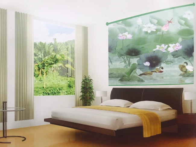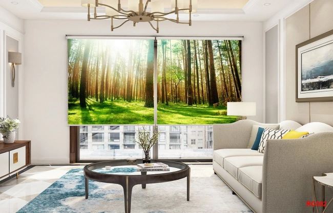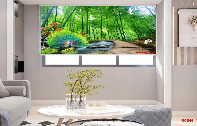 Sự quyến rũ của màu xanh lá cây được làm dịu nhẹ nhờ vào mẫu rèm cuốn in tranh tuyệt đẹp với họa tiết lá dày, được thiết kế trên nền màu kem tự nhiên cổ điển. Điều này tạo ra sự hài hòa, không quá rực rỡ mà vẫn mang đến vẻ đẹp tinh tế.