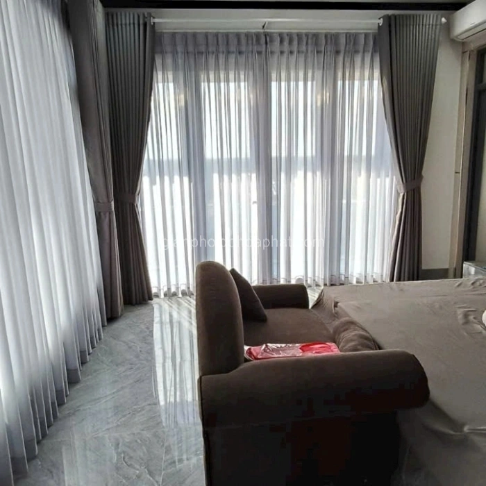 Tại các căn nhà phố có cửa sổ lớn hoặc hướng nắng, rèm vải 2 lớp là giải pháp lý tưởng để giảm nhiệt, chống chói và tạo điểm nhấn nội thất. Lớp vải dày giúp chắn nắng vào buổi trưa, trong khi lớp voan giúp căn phòng đón ánh sáng nhẹ vào buổi sáng hoặc chiều.